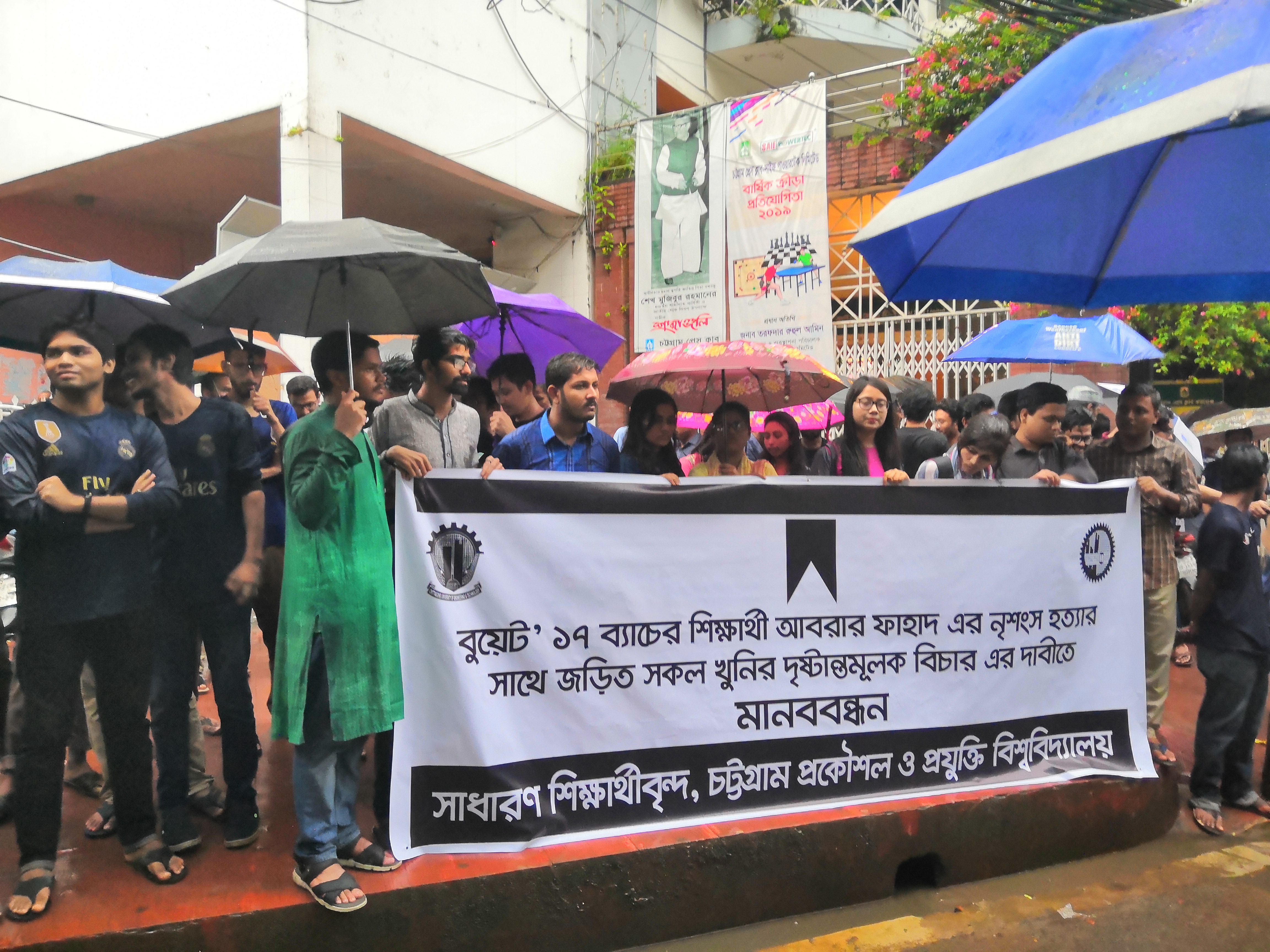 বাংলাদেশ প্রকৌশল বিশ্ববিদ্যালয়ের (বুয়েট) ২০১৭-১৮ শিক্ষাবর্ষের শিক্ষার্থী আবরার ফাহাদ হত্যার বিচারের দাবিতে মানববন্ধন করেছে চট্টগ্রাম প্রকৌশল ও প্রযুক্তি বিশ্ববিদ্যালয়ের (চুয়েট) সাধারণ শিক্ষার্থীবৃন্দ।