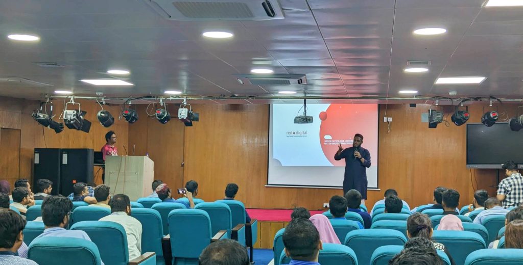 বক্তব্য রাখছেন রেডডট ডিজিটাল লিমিটেডের প্রিন্সিপাল সলিউশন আর্কিটেক্ট তামিম আরেফিন ও রাকিবুল হাসান