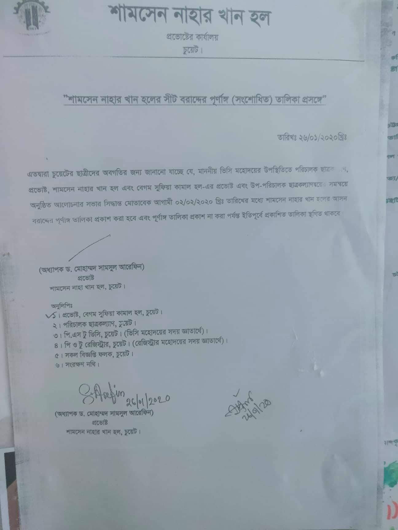 চট্টগ্রাম প্রকৌশল ও প্রযুক্তি বিশ্ববিদ্যালয়ে (চুয়েট) ছাত্রীদের জন্য নবনির্মিত শামসেন নাহার খান হলের আসন বন্টনে অসামঞ্জস্যতার প্রেক্ষিতে রবিবার (২৬জানুয়ারি) শিক্ষার্থীদের ক্লাস বর্জনের ঘটনা ঘটে। এধরণের অনাকাঙ্ক্ষিত ঘটনার প্রেক্ষিতে পরবর্তীতে হল প্রশাসন আসন বরাদ্দের পূর্ববর্তী বিজ্ঞপ্তি স্থগিত করে এবং আগামী ০২ ফেব্রুয়ারি তারিখের মধ্যে পূর্ণাঙ্গ (সংশােধিত) তালিকা প্রকাশ করা হবে এরকম বরাতে হল প্রশাসন এক বিজ্ঞপ্তি প্রকাশ করে।