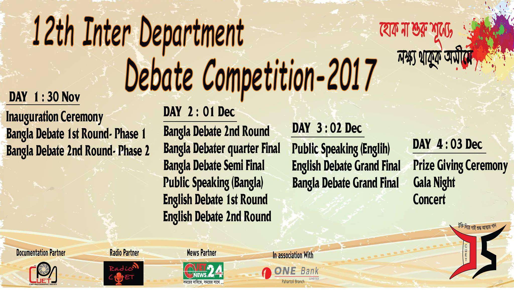 ৩০ নভেম্বর বৃহস্পতিবার অনুষ্ঠানের প্রথম দিনে থাকবে উদ্বোধন এবং বাংলা বিতর্কের ১ম ও ২য় পর্ব । শুক্রবার ২য় দিনে বাংলা বিতর্কের কোয়াটার ও সেমি ফাইনাল অনুষ্ঠিত হবে। এছাড়াও এদিন ইংরেজি বিতর্কের প্রথম ও দ্বিতীয় পর্ব এবং বাংলায় বক্তৃতা প্রতিযোগিতা অনুষ্ঠিত হবে ।
