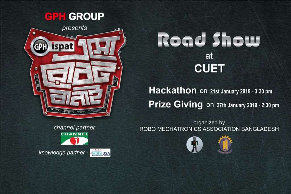চট্টগ্রাম প্রকৌশল ও প্রযুক্তি বিশ্ববিদ্যালয়ে (চুয়েট) আগামীকাল ২১ই জানুয়ারী (সোমবার) অনুষ্ঠিত হতে যাচ্ছে “জিপিএইচ ইস্পাত-এসো রোবট বানায়” এর রোডশোর হ্যাকাথন রাউন্ড। আগামীকাল সোমবার দুপুর ২.৩০-৫.০০ টা পর্যন্ত বিশ্ববিদ্যালয়ের ‘পিএমই সেমিনার রুমে’রোডশোর হ্যাকাথন রাউন্ডটি অনুষ্ঠিত হবে।