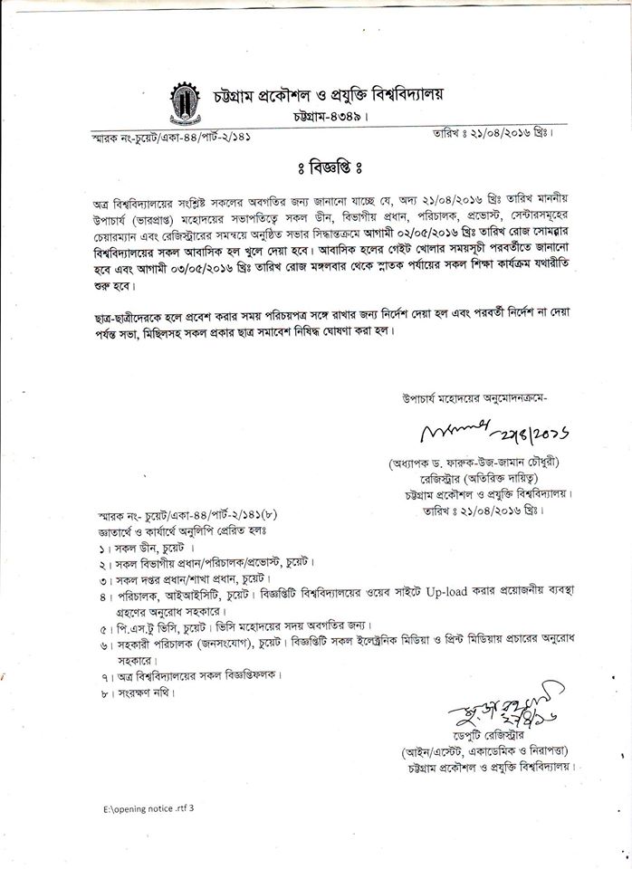 বিজ্ঞপ্তিতে শিক্ষার্থীদের হলে প্রবেশ করার সময় পরিচয়পত্র সঙ্গে রাখার জন্য নির্দেশ দেয়া হয়েছে এবং অনির্দিষ্টকালের জন্য সভা, মিছিলসহ সকল প্রকার ছাত্র সমাবেশ নিষিদ্ধ ঘোষণা করা হয়েছে। এছাড়াও এতে বলা হয় আবাসিক হলের গেইট খোলার সময়সূচী পরবর্তীতে জানানো হবে।
