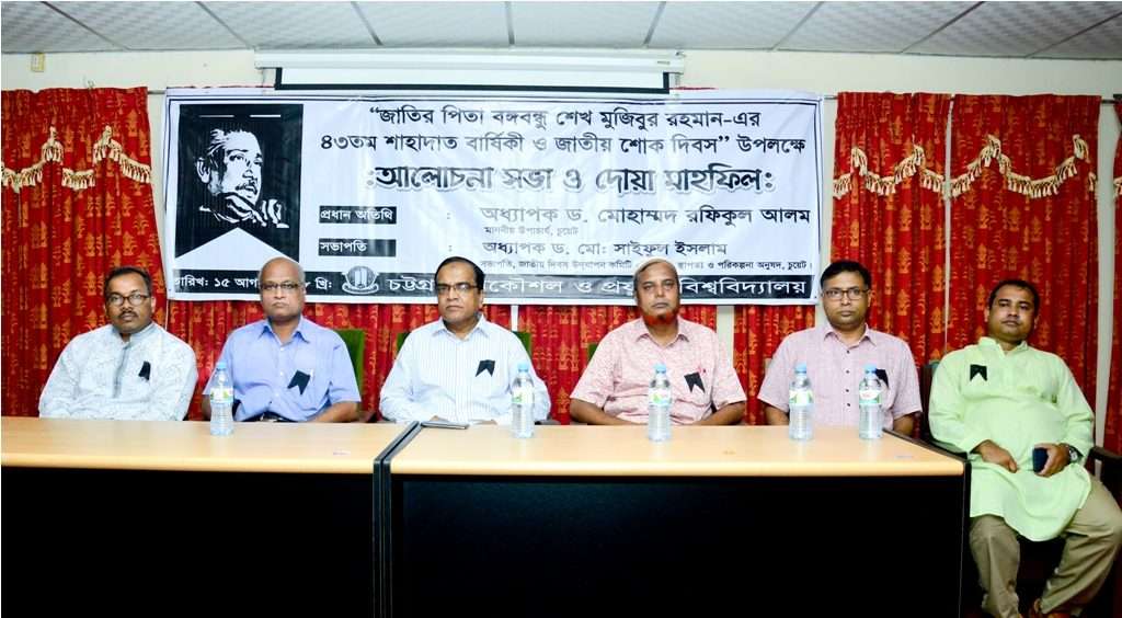 পরে বিশ্ববিদ্যালয়ের প্রশাসনিক ভবনের সামনে জাতীয় পতাকা ও শোকের প্রতীক কালো পতাকা উত্তোলন করা হয়। এরপর পুরকৌশল বিভাগের সেমিনার কক্ষে বঙ্গবন্ধুর জীবন ও কর্ম নিয়ে আলোচনা সভা অনুষ্ঠিত হয়। এতে প্রধান অতিথি ছিলেন উপাচার্য অধ্যাপক ড. মোহাম্মদ রফিকুল আলম।