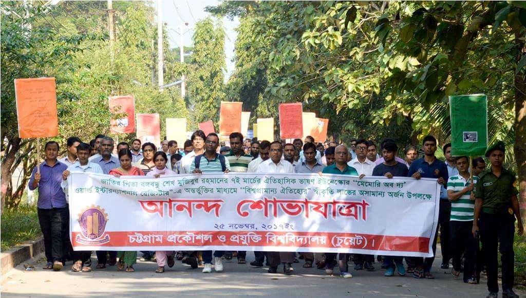 জাতির জনক বঙ্গবন্ধু শেখ মুজিবুর রহমানের ঐতিহাসিক ৭ই মার্চের ভাষণকে ইউনেস্কো ঐতিহাসিক দলিল হিসেবে স্বীকৃতি দেওয়া উপলক্ষে ২৫ নভেম্বর এক আনন্দ শোভাযাত্রা চট্টগ্রাম প্রকৌশল ও প্রযুক্তি বিশ্ববিদ্যালয়ে (চুয়েট ) অনুষ্ঠিত হয়।