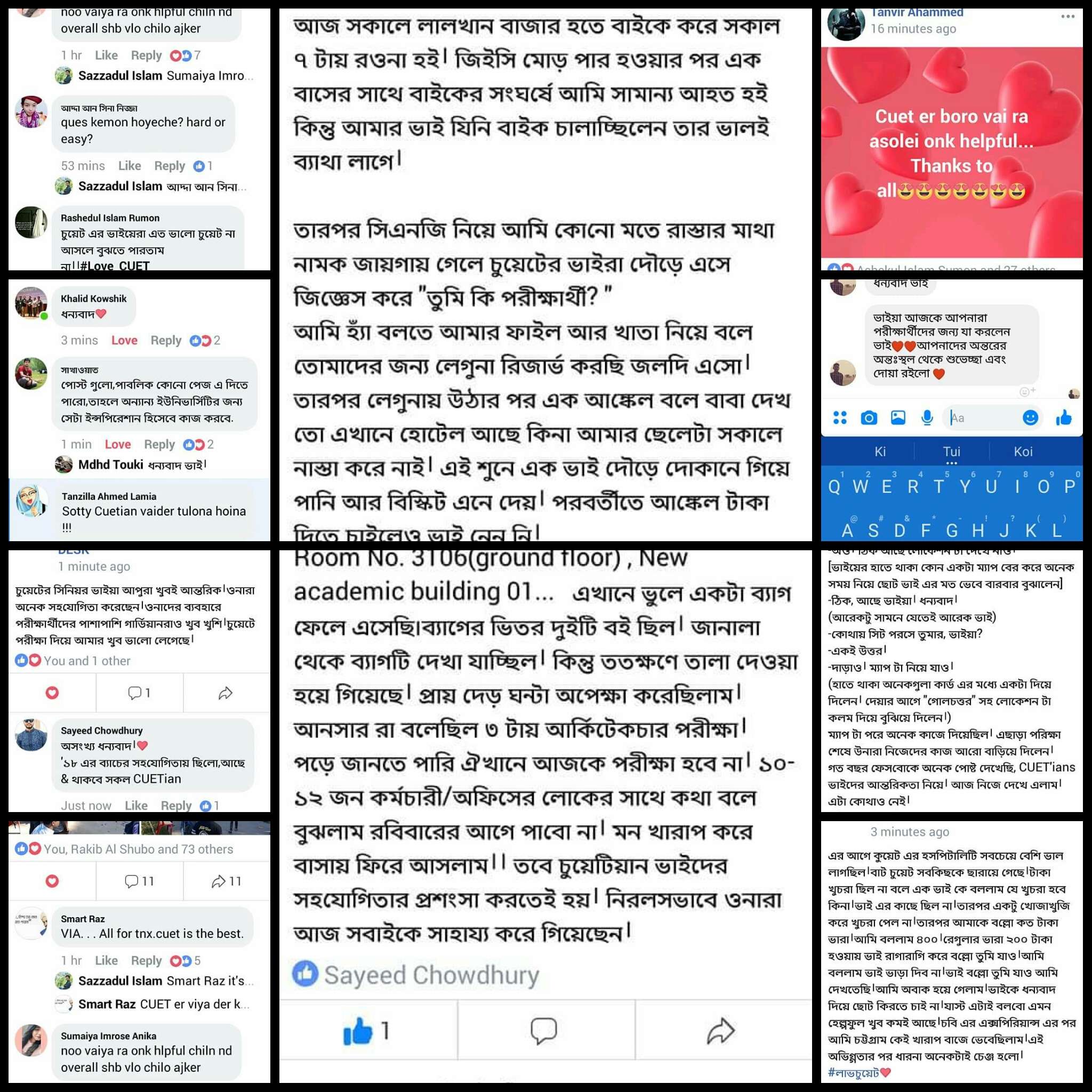 চুয়েটের সামনে নামার পর সাথে সাথে এক ভাই আমাকে বলে সিট কোন হলে আমি বলি ইএমই বিল্ডিং, সাথে সাথে ভাই হাত ধরে বলে এসো আমি দেখিয়ে দিচ্ছি।এরকম ভাবে ছোট ভাইদের এত হেল্প করে তা আমি আরো যে ভার্সিটিতে এক্সাম দিয়েছি সেখানে দেখি নি।ভাইদের সবাইকে আমার আন্তরিক ভালবাসা।