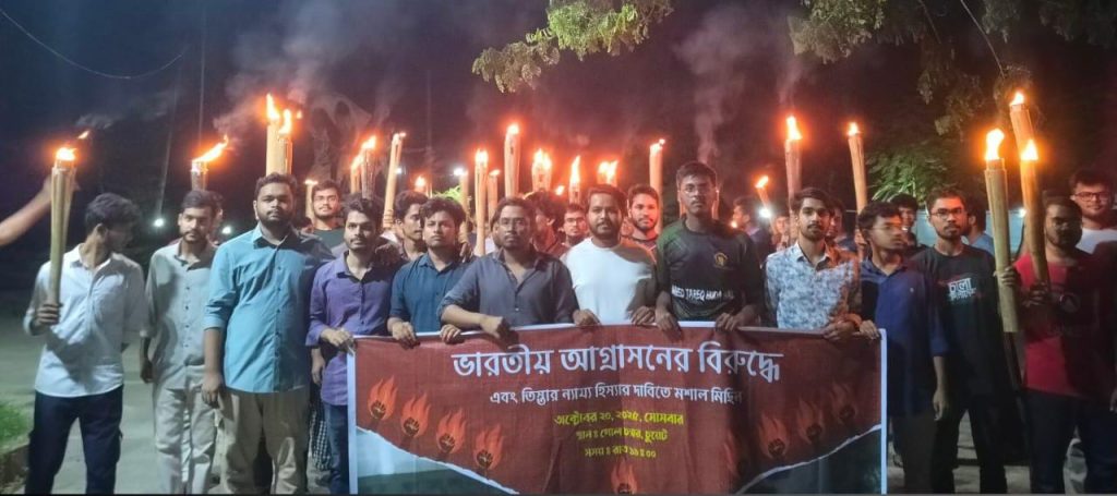 এসময় মশাল হাতে শিক্ষার্থীরা ‘জাগো বাহে – তিস্তা বাচাও’, ‘ভারতের দালালেরা- হুশিয়ার সাবধান’, ‘ভারত যদি বন্ধু হও – তিস্তার পানি বুঝিয়ে দাও’ ইত্যাদি স্লোগান দিতে থাকেন।
