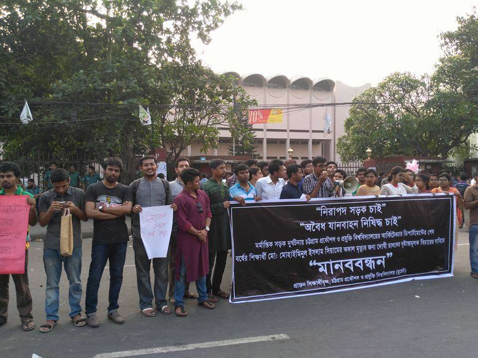 Students of Chittagong University of Engineering & Technology (CUET) formed a human chain in Dhaka for safe transportation for cuetian and for prosecution of alleged driver. They formed human chain on 8th April at 5.00 pm at Shahbug circle, in Dhaka.